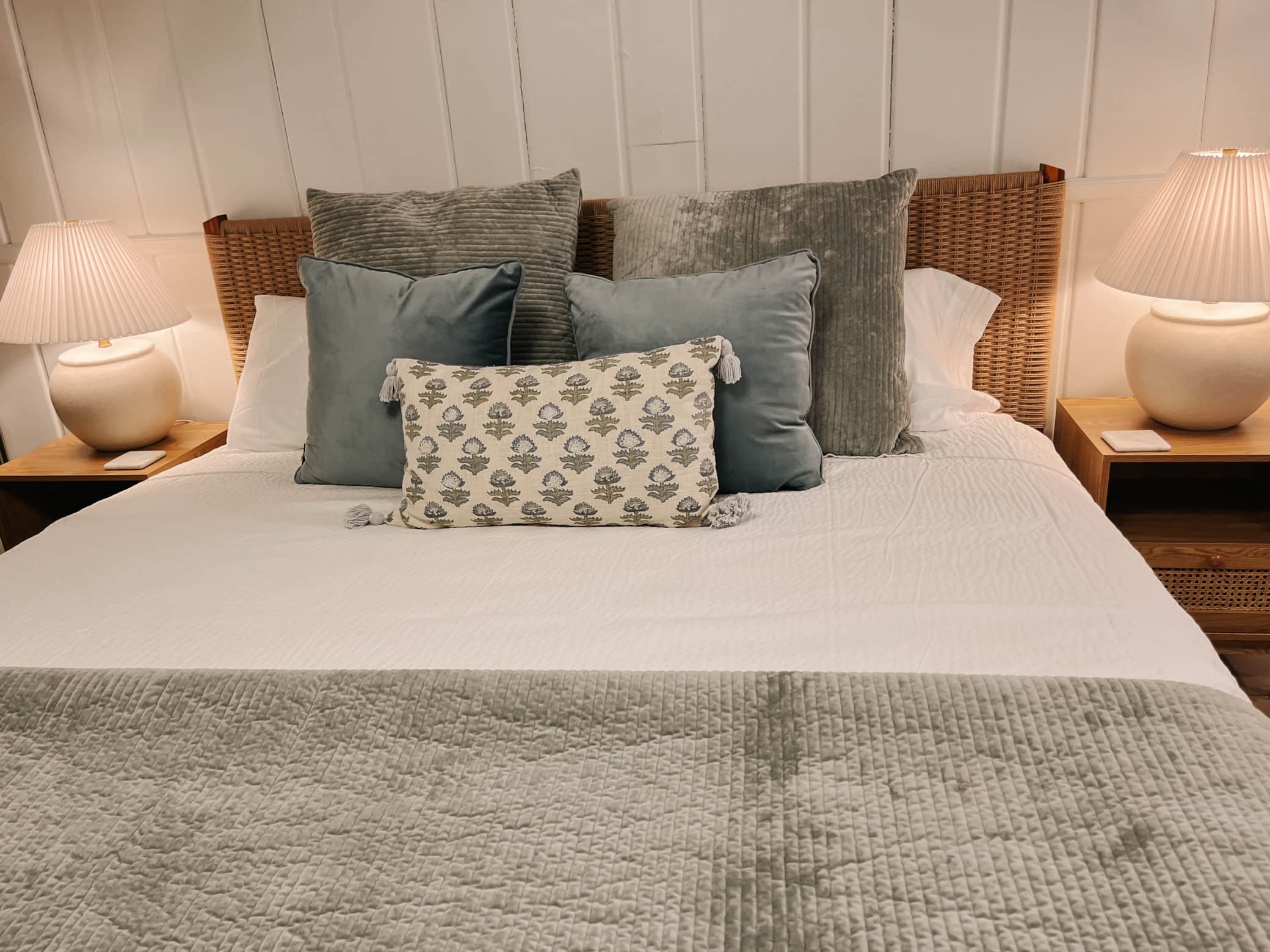 Like the Lake Michigan waters, this room is bursting with shades of blue! This 300 sq ft, king room sleeps two. This room boasts a private bathroom with our largest walk-in tile shower, updated white oak plank flooring, new lighting, as well as amenities like a mini fridge, microwave, and Keurig, ensuring a comfortable stay. Accompanied by a cozy corner, that allows for the perfect spot to unwind after a fun day at the lake.
